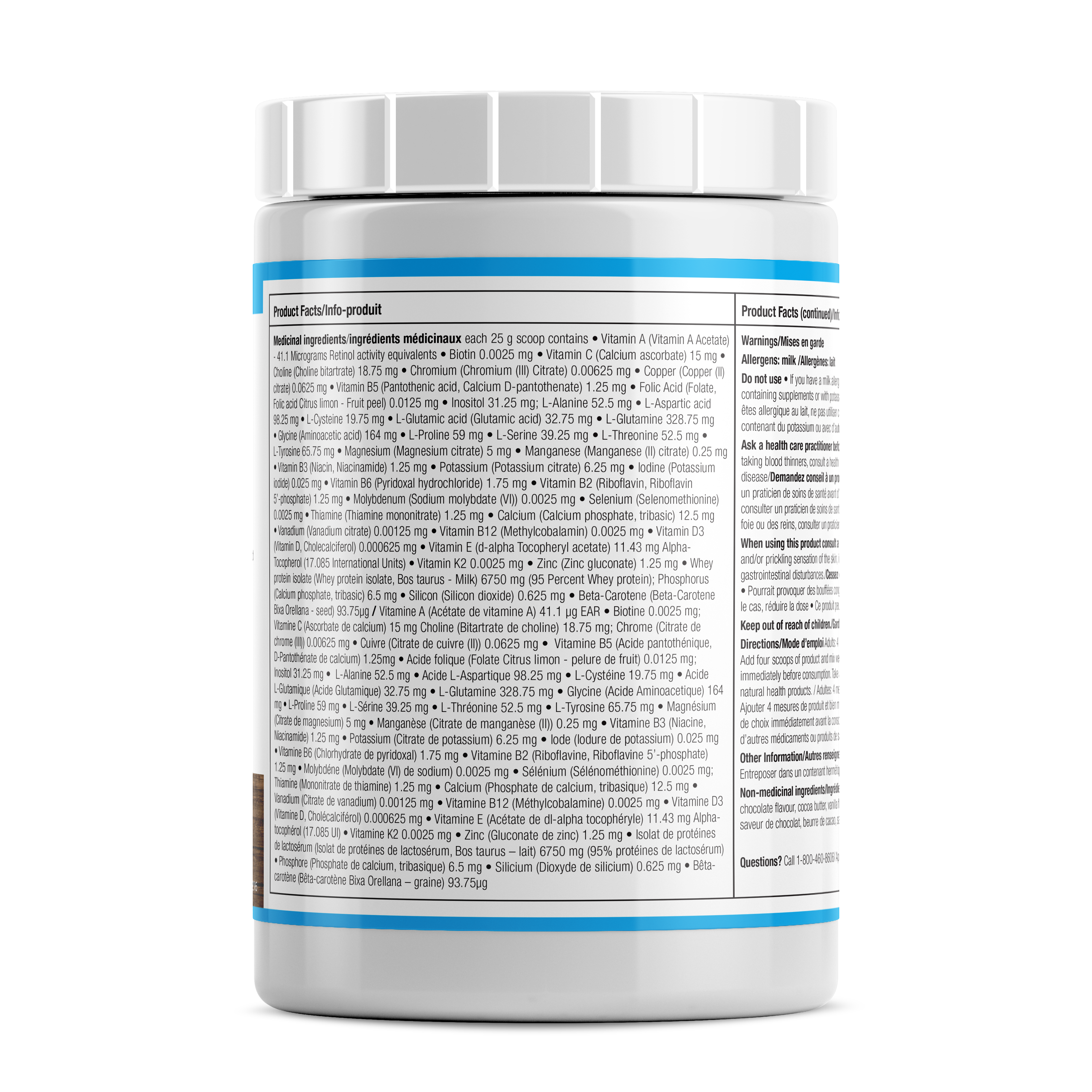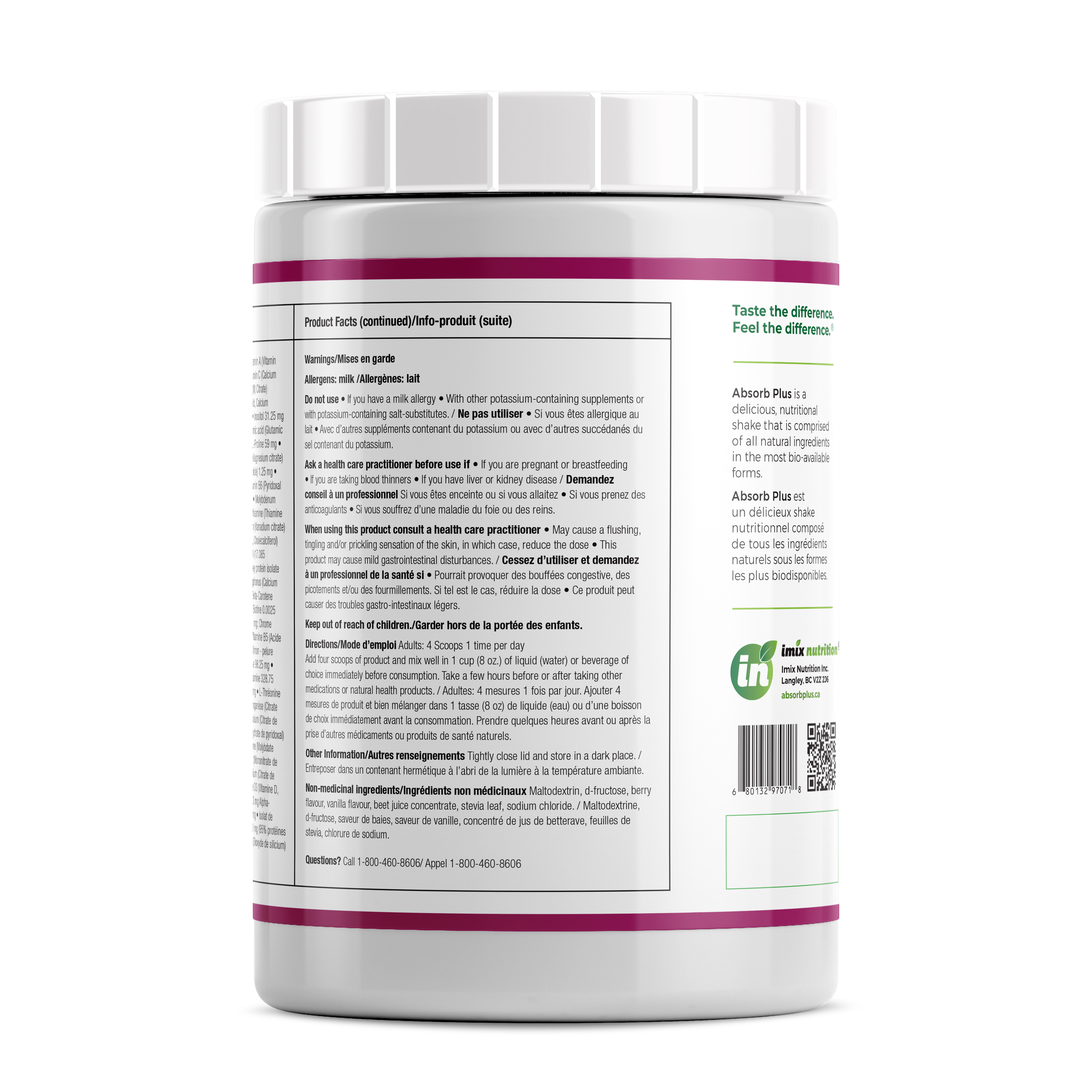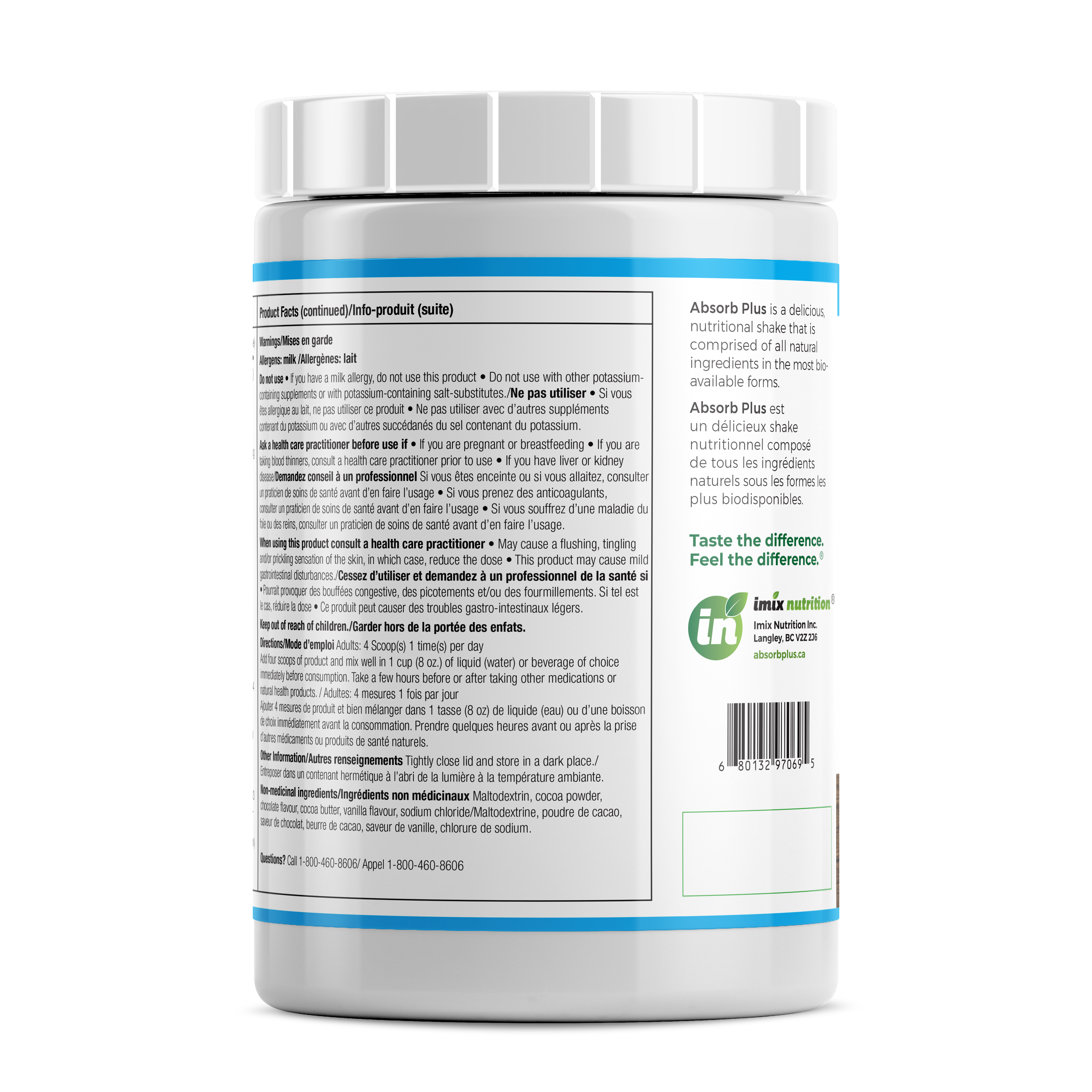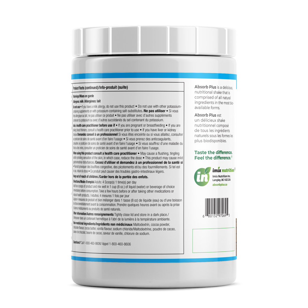 NOTE: Health Canada limits the amount of potassium we can include per shake. So, along with the naturally-occurring potassium in the whey isolate, each serving of Absorb Plus Original contains 71 mg potassium per serving. As there is 137 mg of sodium per shake (another important electrolyte) we suggest you add 100 mg of potassium citrate per shake, to balance the sodium/potassium ratio, if you are on an exclusively elemental diet.